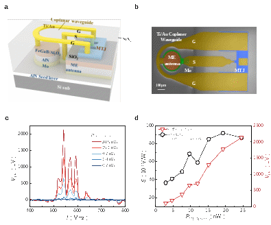The research team innovatively proposed a monolithic integration strategy combining magnetoelectric materials with spintronic materials. By exploiting magnetoelectric coupling effects to fabricate a miniaturized magnetoelectric antenna and leveraged electron spin properties to achieve highly sensitive microwave detection. Through magnetron sputtering and chemical mechanical polishing processes, atomic-level precision and seamless monolithic integration of multiple materials were realized. By further integrating micro-nano fabrication and MEMS processing technologies, an on-chip integrated device compatible with CMOS processes was developed. With a total area occupation of less than 0.4 mm², this device enables highly sensitive wireless detection of microwave signals, achieving a detection sensitivity exceeding 90 kV/W and a noise-equivalent power as low as approximately 3 pW/√Hz.